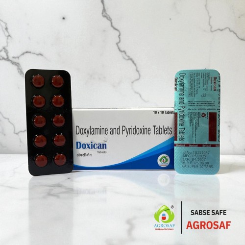 | Description: | DOXICAN Tablet is a combination of Doxylamine Succinate 10mg, an antihistamine, and Pyridoxine Hydrochloride (Vitamin B6) 10mg. This formulation is primarily used for the management of nausea and vomiting, especially during pregnancy (morning sickness). Doxylamine helps reduce nausea by blocking histamine receptors, while Vitamin B6 supports metabolic functions and further reduces nausea. The combination is widely recommended due to its safety and effectiveness. |