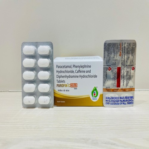 | Description: | PAROFIN C COLD Tablet is a multi-action formulation containing Paracetamol 500 mg, Phenylephrine hydrochloride 5 mg, Caffeine 30 mg, and Diphenhydramine hydrochloride 25 mg. It is designed to relieve symptoms of common cold, flu, sinus congestion, and associated headaches. Paracetamol reduces fever and pain, Phenylephrine alleviates nasal congestion, Caffeine enhances alertness, and Diphenhydramine helps relieve sneezing and runny nose. |