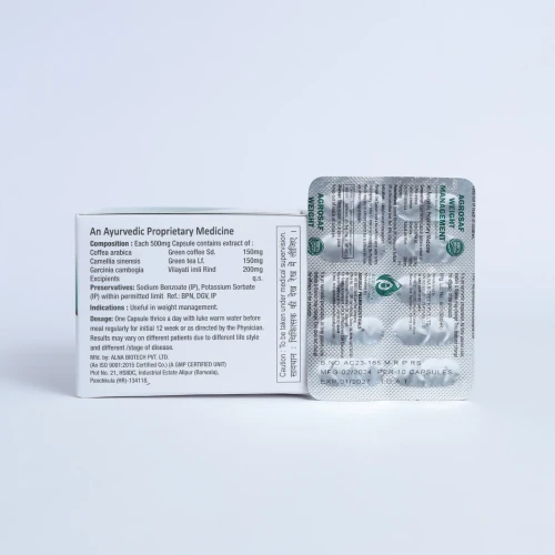 | COMPOSITION: | Each 500mg Capsule Contains Extract Of : Coffea Arabica Green Coffee Sd. 150mg, Camellia Sinensis Green Tea Lf. 150mg, Garcinia Cambogia Vilayati Imli Rind 200mg, Excipients Q.s. |