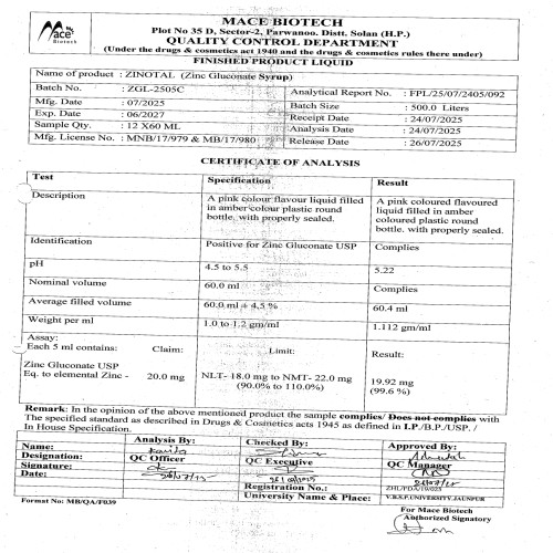 | Description: | ZINOTAL SYRUP is a zinc supplement containing Zinc Gluconate (20mg/5ml), formulated to support immune function, improve wound healing, and help in the treatment of acute diarrhea in children. It plays a critical role in various enzyme functions and contributes to overall health and growth, especially in pediatric patients. |