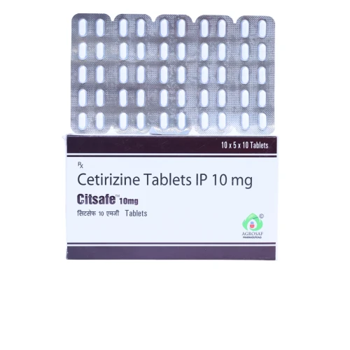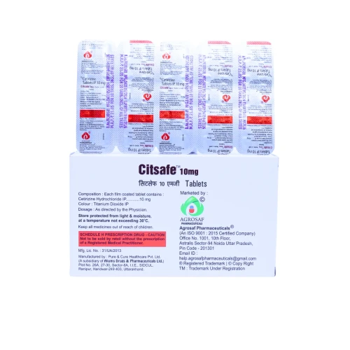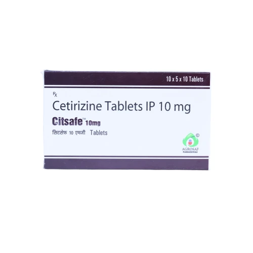 CITSAFE 10 Tablet is used to treat allergy symptoms such as sneezing, runny nose, itching, and hives.