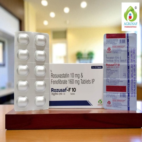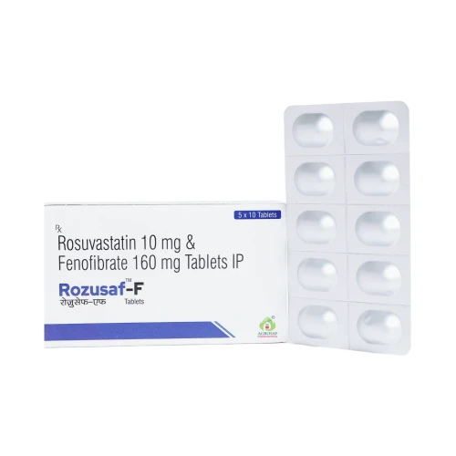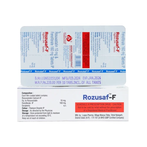 | Description: | ROZUSAF F 10 Tablet is a combination of Rosuvastatin 10 mg and Fenofibrate 160 mg. It is used for the management of mixed dyslipidemia and hypertriglyceridemia. Rosuvastatin reduces LDL (bad cholesterol), while Fenofibrate significantly lowers triglycerides and increases HDL (good cholesterol), providing comprehensive lipid management. |