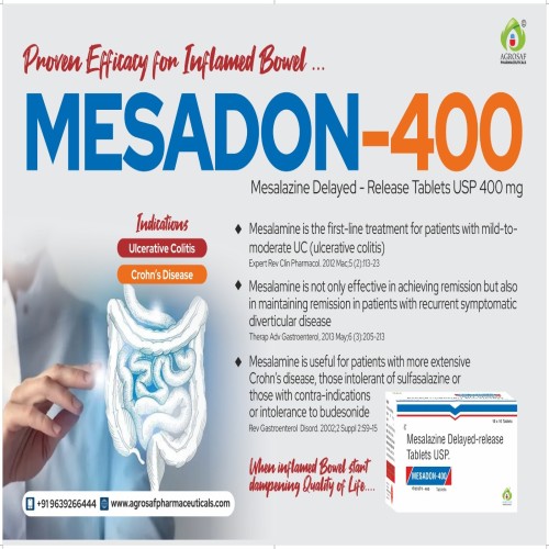 | Description: | MESADON 400 Tablet contains Mesalazine 400mg, an anti-inflammatory medication used primarily for the treatment of inflammatory bowel diseases (IBD) such as ulcerative colitis and Crohn’s disease. Mesalazine works by reducing inflammation in the lining of the intestines, helping to relieve symptoms like abdominal pain, diarrhea, and rectal bleeding. It is widely prescribed for both induction and maintenance therapy to achieve and maintain remission in patients with IBD. |