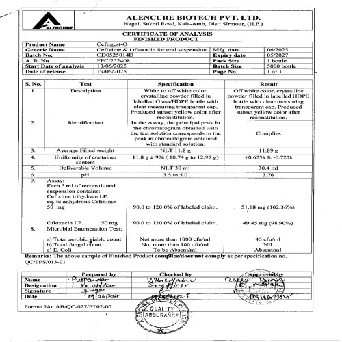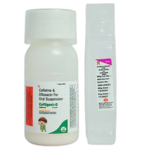 | Description: | CEFTIGEST-O Dry Syrup is a powerful antibiotic combination of Cefixime and Ofloxacin, designed for pediatric use. Cefixime, a third-generation cephalosporin, inhibits bacterial cell wall synthesis, while Ofloxacin, a fluoroquinolone, disrupts bacterial DNA replication. Together, they effectively treat a wide range of bacterial infections including respiratory tract infections, urinary tract infections, gastrointestinal infections, and ENT infections in children. |