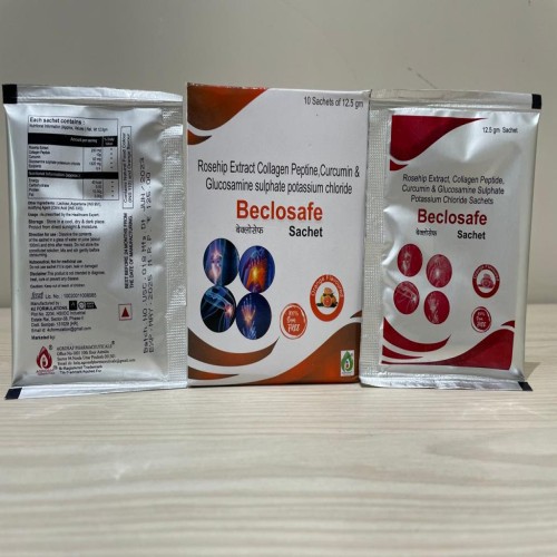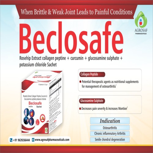 | Description: | BECLOSAFE SACHET is a premium joint and bone health supplement combining Roip Extract (250mg), Collagen Peptine (10g), Curcumin (50mg), and Glucosamine Sulphate Potassium Chloride (1320mg). It supports cartilage repair, joint flexibility, and overall mobility. Ideal for adults seeking relief from joint discomfort and maintaining healthy bones. Easy-to-use sachet format ensures convenient daily intake. |