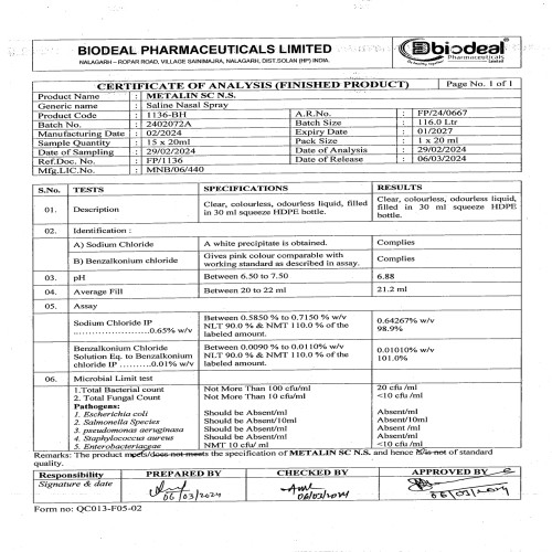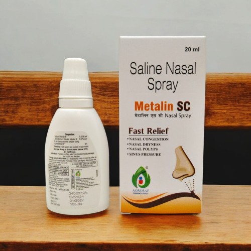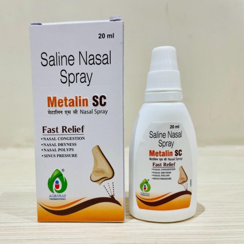 | Description: | METALIN SC Nasal Spray is a saline-based nasal formulation containing Sodium Chloride 0.65% w/v, designed to moisturize and cleanse the nasal passages. It helps in relieving nasal dryness, irritation, and mild congestion by loosening mucus and maintaining nasal hydration. The presence of Benzalkonium Chloride ensures product stability and sterility. This spray is suitable for daily nasal hygiene, making it ideal for use in all age groups, including children and elderly patients. |