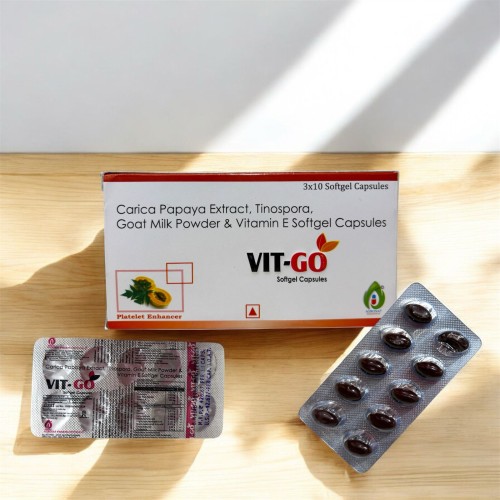 | Description: | VIT GO Capsule is a natural formulation containing Carica Papaya Extract (350mg), Tinospora (150mg), Goat Milk Powder (100mg), and Vitamin E (40mg). This unique combination helps support platelet count, boost immunity, and improve overall recovery in weakness and fatigue. It is especially useful during viral infections and post-illness recovery. |