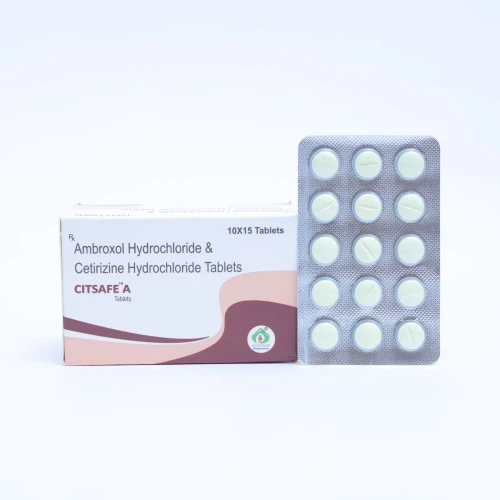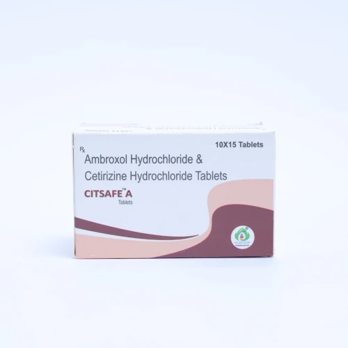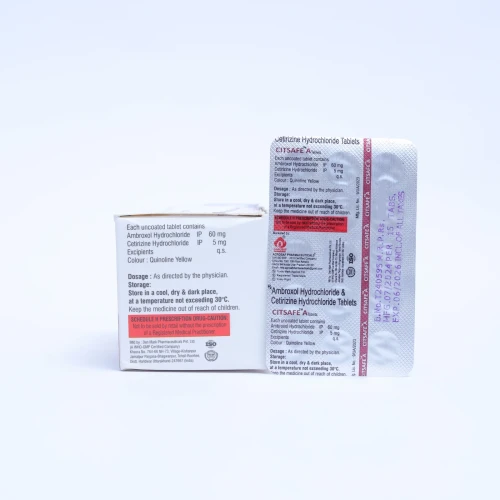 | Description: | CITSAFE A Tablet is a combination medication containing Cetirizine 5 mg and Ambroxol 60 mg. Cetirizine is an antihistamine that helps relieve allergy symptoms such as sneezing, runny nose, and itching, while Ambroxol is a mucolytic agent that helps thin and loosen mucus in the airways. This combination is effective in managing allergic respiratory conditions associated with cough and mucus buildup, providing relief from symptoms and improving breathing comfort. |