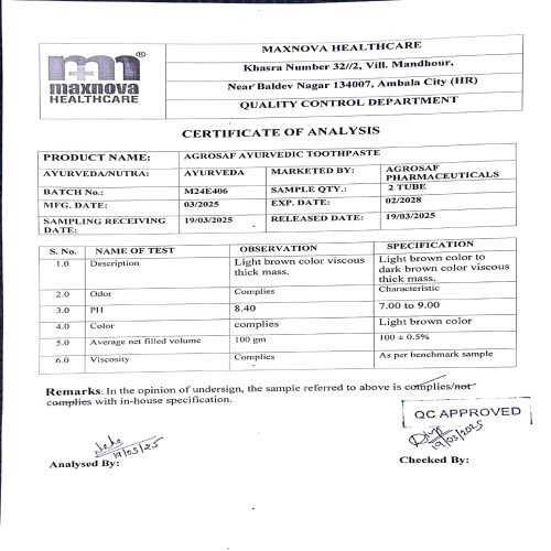 AGROSAF Ayurvedic Toothpaste is generally well tolerated. Rarely, some users may experience mild gum irritation or allergic reactions.