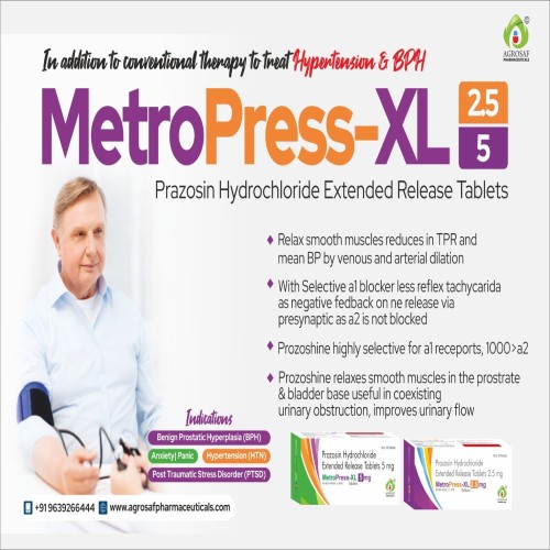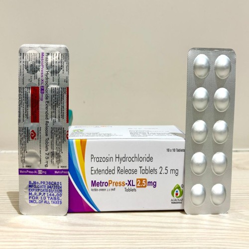 | Description: | METROPRESS-XL 2.5 Tablet contains Prazosin hydrochloride 2.5 mg in an extended-release formulation. It is primarily used for the management of hypertension (high blood pressure) and symptoms of benign prostatic hyperplasia (BPH). The extended-release formulation ensures a steady release of medication over 24 hours, helping to maintain consistent blood pressure control and reduce urinary symptoms in BPH. |