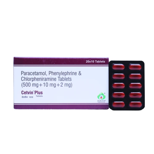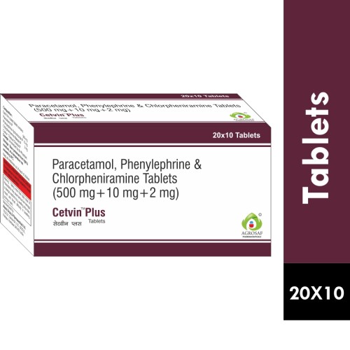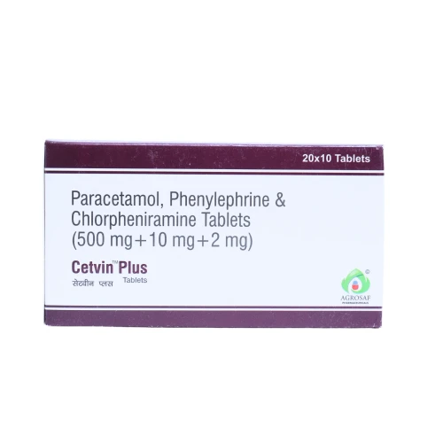 | Description: | CETVIN PLUS Tablet is a combination medicine containing Chlorpheniramine Maleate 2 mg, Paracetamol 500 mg, and Phenylephrine 10 mg. It is commonly used for the relief of symptoms associated with common cold, flu, and allergic conditions. Chlorpheniramine is an antihistamine that reduces allergy symptoms, Paracetamol acts as an analgesic and antipyretic to relieve pain and fever, and Phenylephrine is a decongestant that helps reduce nasal congestion. This combination provides comprehensive relief from multiple cold and allergy symptoms. |
