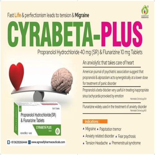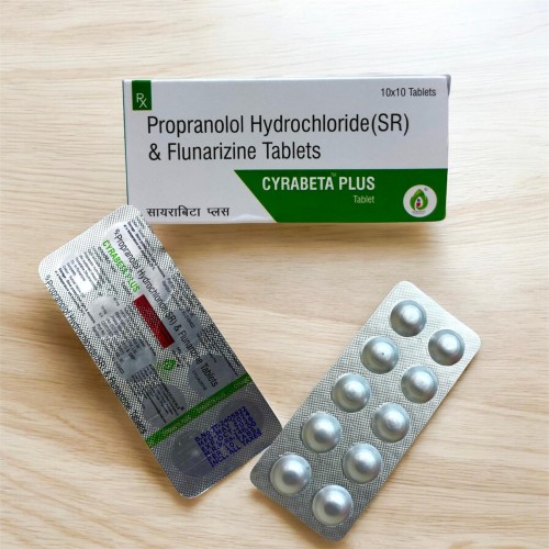 | Description: | CYRABETA PLUS Tablet is a combination of Propranolol 40 mg and Flunarizine 10 mg. It is primarily used for the prevention of migraine and management of vestibular disorders. Propranolol helps reduce vascular stress and stabilizes heart rate, while Flunarizine improves cerebral blood flow and reduces frequency and severity of migraine attacks. |