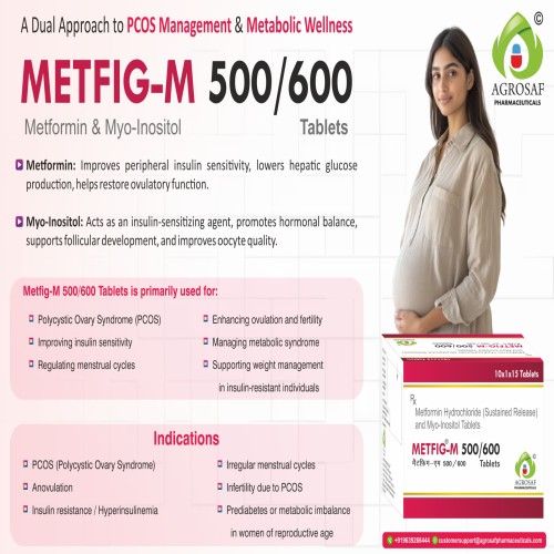 | Description: | METFIG-M 500/600 Tablet is a combination medication used to support blood sugar control and improve insulin sensitivity. It contains Metformin Hydrochloride (Sustained Release) 500 mg and **Myo‑Inositol 600 mg. Metformin helps reduce glucose production in the liver and improves the body’s response to insulin, thereby lowering blood sugar levels. Myo-inositol plays an important role in cellular signaling and helps improve insulin sensitivity and metabolic balance. This combination is commonly used in the management of Type 2 Diabetes Mellitus and may also support metabolic health in conditions such as Polycystic Ovary Syndrome (PCOS) where insulin resistance is a key factor. |