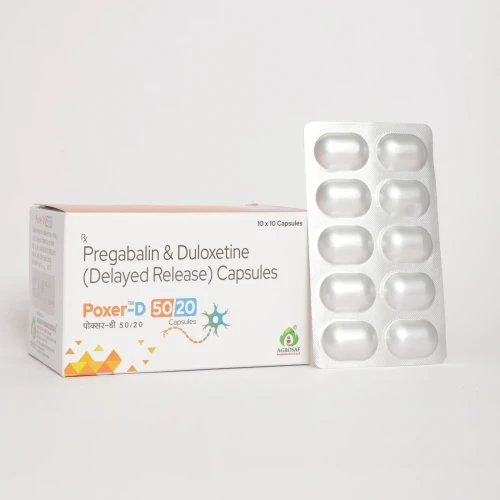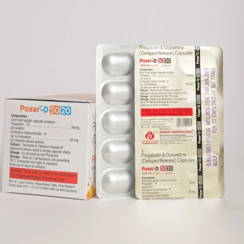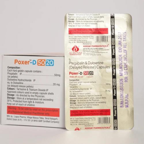 | Description: | POXER-D 50/20 Capsule is a combination medicine containing Pregabalin 50 mg and Duloxetine 20 mg, designed for the management of neuropathic pain, fibromyalgia, and certain anxiety or depressive disorders associated with nerve pain. Pregabalin works by reducing abnormal nerve signals responsible for pain, while Duloxetine, a serotonin-norepinephrine reuptake inhibitor (SNRI), helps modulate pain perception and improve mood. This synergistic combination provides effective relief from nerve-related pain and associated symptoms while supporting overall quality of life. |