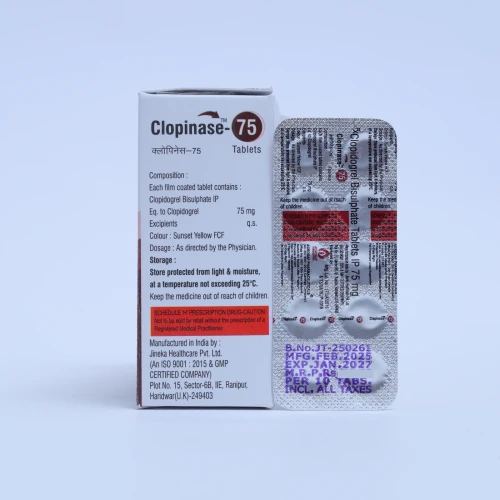 | Description: | CLOPINASE 75 Tablet contains Clopidogrel 75 mg (as Clopidogrel bisulphate), an antiplatelet medication used to prevent blood clots in patients at risk of cardiovascular events. It works by inhibiting platelet aggregation, thereby reducing the risk of heart attack, stroke, and other clot-related conditions. CLOPINASE 75 Tablet is commonly prescribed for patients with a history of myocardial infarction, ischemic stroke, or peripheral arterial disease, as well as after stent placement. |