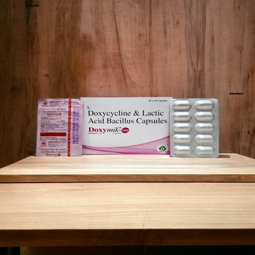 | Description: | DOXYMIK 100 Capsule is a combination antibiotic formulation containing Doxycycline (100 mg) and Lactic Acid Bacillus. Doxycycline is a broad-spectrum tetracycline antibiotic that inhibits bacterial protein synthesis, effectively treating a wide range of infections including respiratory, urinary, skin, and sexually transmitted infections. The addition of Lactic Acid Bacillus helps maintain healthy intestinal flora, reducing the risk of antibiotic-associated diarrhea and improving gut tolerance. This combination ensures effective infection control along with better gastrointestinal safety. |