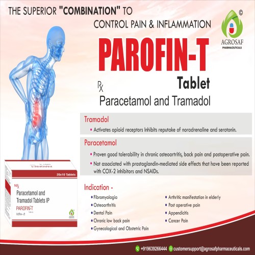 | Description: | PAROFIN T Tablet contains Paracetamol 325 mg and Tramadol 37.5 mg. This combination is used for the management of moderate to moderately severe pain, including musculoskeletal pain, post-operative pain, and chronic pain conditions. Paracetamol provides effective pain relief and fever reduction, while Tramadol enhances analgesic efficacy through its central opioid activity. |