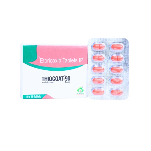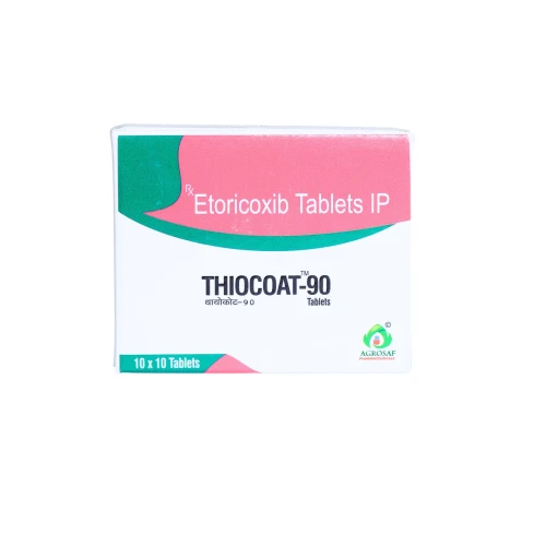 | Description: | THIOCOAT 90MG Tablet contains Etoricoxib 90mg, a selective COX-2 inhibitor (NSAID) used to treat pain, inflammation, and swelling associated with osteoarthritis, rheumatoid arthritis, ankylosing spondylitis, and acute musculoskeletal pain. Etoricoxib selectively inhibits the COX-2 enzyme, which reduces pain and inflammation while minimizing gastrointestinal side effects compared to traditional non-selective NSAIDs. THIOCOAT 90MG is ideal for moderate pain and inflammation management. |