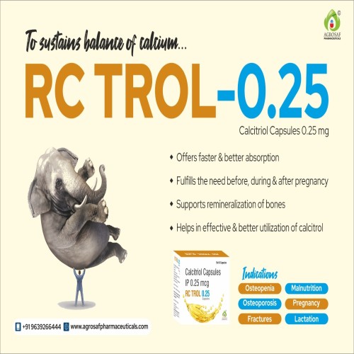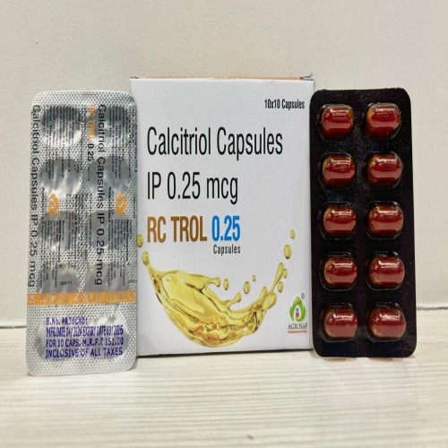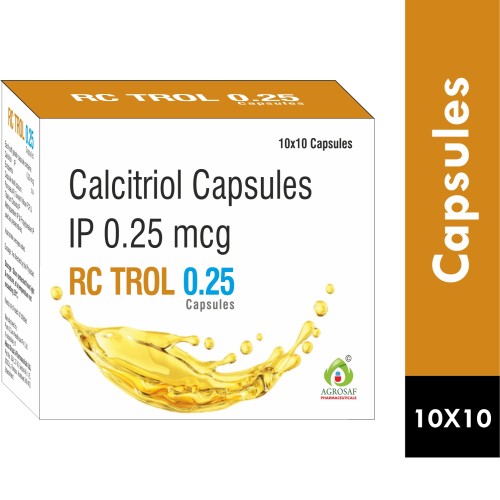 | Description: | RC TROL 0.25 Capsule contains Calcitriol 0.25 mcg, the active form of Vitamin D3, used to regulate calcium and phosphate levels in the body. It is primarily prescribed for patients with calcium deficiency, bone disorders, and conditions related to impaired Vitamin D metabolism such as chronic kidney disease. Calcitriol helps improve calcium absorption from the intestine and supports proper bone mineralization, making it essential for maintaining strong and healthy bones. |