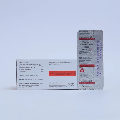| Description: | EBASAFE M Tablet is a combination of Ebastine 10mg, a second-generation antihistamine, and Montelukast 10mg, a leukotriene receptor antagonist. This dual-action formulation is used for the management of allergic conditions such as allergic rhinitis, seasonal allergies, and respiratory allergies. Ebastine blocks histamine to relieve symptoms like sneezing and itching, while Montelukast reduces airway inflammation and allergic responses, providing comprehensive allergy control. |