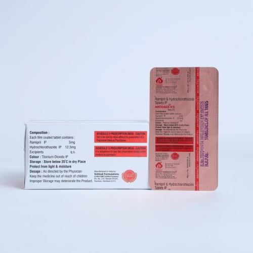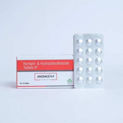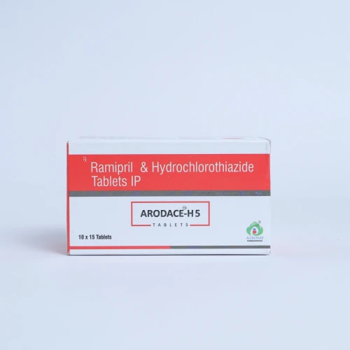 | Description: | ARODACE H 5 Tablet is a combination of Ramipril 5 mg and Hydrochlorothiazide 12.5 mg. It is used for the management of hypertension (high blood pressure) in patients requiring stronger combination therapy. Ramipril relaxes blood vessels by inhibiting ACE, while Hydrochlorothiazide helps eliminate excess fluid and sodium, resulting in effective blood pressure reduction. |