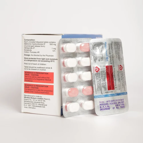 MEPRIMET M1 contains Metformin 500mg in combination with Glimepiride 1mg, offering dual-action blood sugar control.