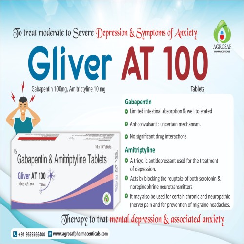 | Description: | GLIVER AT 100 Tablet is a combination medicine containing: Gabapentin 100mg – an anticonvulsant that helps reduce nerve pain signals. Amitriptyline 10mg – a tricyclic antidepressant that enhances pain modulation and improves mood and sleep. This combination is widely used for the management of neuropathic pain conditions such as diabetic neuropathy, post-herpetic neuralgia, and chronic nerve pain disorders. GLIVER AT 100 provides dual-action relief by targeting both nerve transmission and pain perception. |