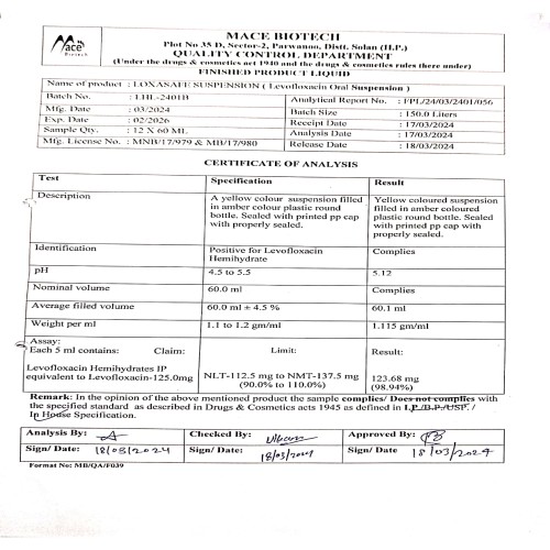 | Description: | Loxasafe Syrup contains Levofloxacin, a broad-spectrum fluoroquinolone antibiotic. It works by inhibiting bacterial DNA gyrase, thus preventing replication and repair of bacterial DNA. It is effective against various Gram-positive and Gram-negative organisms. * Indications: