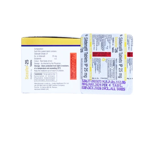 | Description: | SEXOFER 25 Tablet contains Sildenafil 25 mg. It is used for the treatment of erectile dysfunction (ED) in men. Sildenafil works by increasing blood flow to the penile region by relaxing blood vessels, helping achieve and maintain an erection during sexual stimulation. This lower strength is suitable for initial therapy or patients requiring a reduced dose for better tolerability. |
