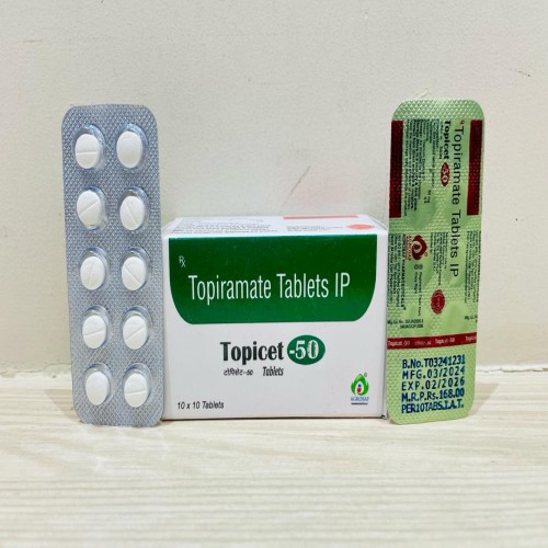 | Description: | TOPICET 50 Tablet contains Topiramate 50mg, an anticonvulsant medication used for the treatment of epilepsy and prevention of migraine headaches. It works by stabilizing abnormal electrical activity in the brain and reducing excessive nerve signals, helping control seizures and decrease migraine frequency. The 50mg strength is commonly used as a maintenance or step-up dose after initial titration. |