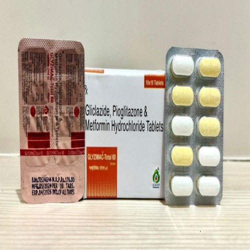 | Description: | GLYZIMAC TOTAL 60 Tablet is a triple-combination antidiabetic medication containing: Gliclazide 60mg – a sulfonylurea that stimulates insulin secretion from pancreatic beta cells. Pioglitazone 15mg – a thiazolidinedione that improves insulin sensitivity in peripheral tissues. Metformin Hydrochloride 500mg – a biguanide that reduces hepatic glucose production and enhances insulin utilization. This advanced formulation is designed for the management of Type 2 Diabetes Mellitus, particularly in patients requiring intensive glycemic control. It provides comprehensive glucose regulation by targeting multiple mechanisms involved in blood sugar management. |