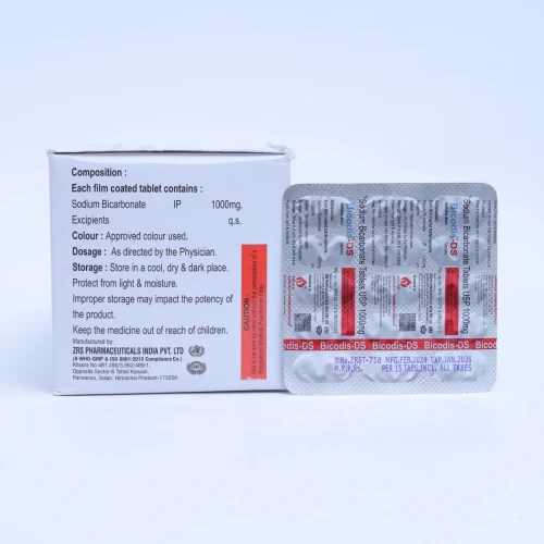 | Description: | BICODIS DS Tablet contains Sodium Bicarbonate 1000mg, an alkalizing agent used to neutralize excess stomach acid and manage conditions associated with metabolic acidosis. It works by increasing the pH of blood and urine, thereby reducing acidity levels in the body. This formulation is commonly used in conditions like acid indigestion, heartburn, and certain kidney-related disorders where acid balance needs to be maintained. |