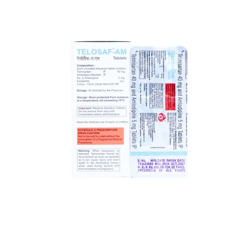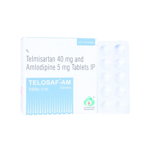 | Description: | TELOSAF AM Tablet is a combination of Telmisartan 40mg (an angiotensin II receptor blocker – ARB) and Amlodipine 5mg (a calcium channel blocker), used for the effective management of hypertension (high blood pressure). Telmisartan relaxes blood vessels by blocking angiotensin II, while Amlodipine helps widen blood vessels by inhibiting calcium influx. This dual mechanism ensures better blood pressure control and reduces cardiovascular risks. |