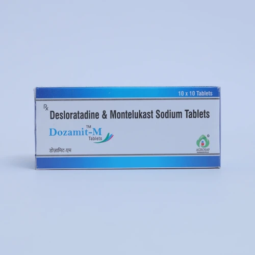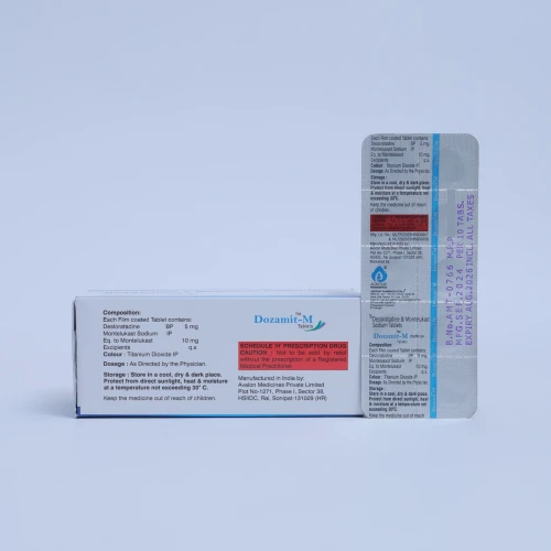 | Description: | DOZAMIT M Tablet is a combination of Desloratadine 5mg and Montelukast 10mg, designed to provide effective relief from allergic conditions and respiratory allergies. Desloratadine is a non-sedating antihistamine that blocks histamine, while Montelukast is a leukotriene receptor antagonist that reduces inflammation and airway constriction. This dual-action formula is widely used in the management of allergic rhinitis, seasonal allergies, and asthma-related symptoms. |