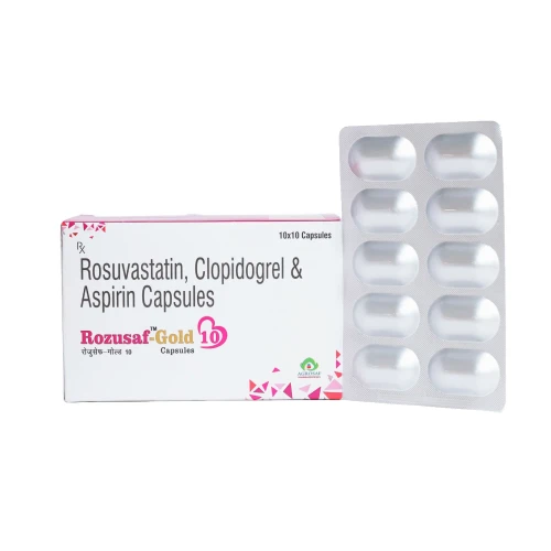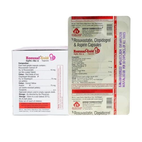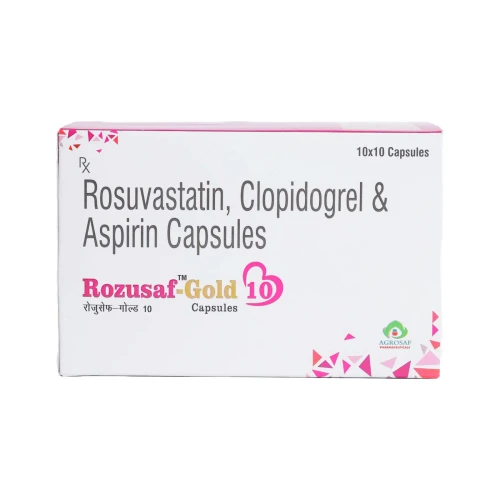 | Description: | ROZUSAF GOLD 10 Capsule is a triple-action cardiovascular therapy designed for patients at high risk of heart attack, stroke, or other thrombotic events. It contains Rosuvastatin 10 mg to lower cholesterol, Clopidogrel 75 mg to inhibit platelet aggregation, and Aspirin 75 mg (enteric-coated pellets) for additional antiplatelet protection. This combination helps control lipid levels, prevent blood clots, and protect heart and vascular health, offering comprehensive cardiovascular support in a single capsule. |