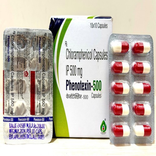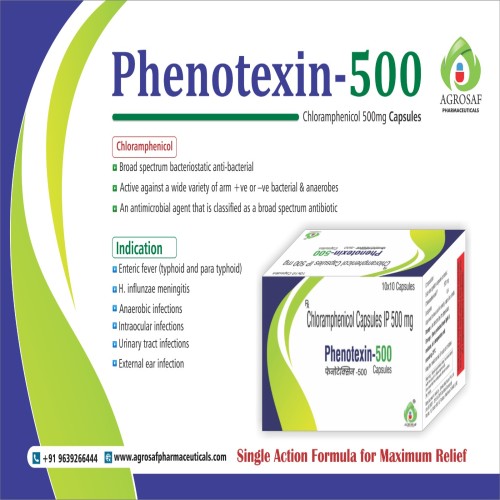 | Description: | PHENOTEXIN-500 Capsules contain Chloramphenicol 500 mg, a broad-spectrum antibiotic used for the treatment of serious bacterial infections when other antibiotics are not effective or suitable. It works by inhibiting bacterial protein synthesis, thereby stopping the growth and multiplication of bacteria. This medicine is commonly used in infections such as typhoid fever, respiratory tract infections, meningitis, and certain severe infections caused by susceptible organisms. Due to its potency, it is typically reserved for specific clinical conditions under medical supervision. |