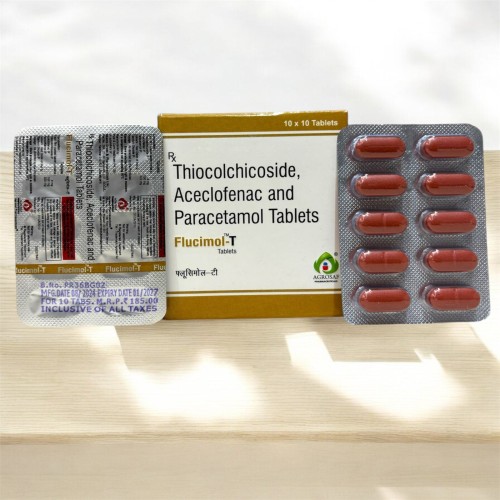 | Description: | FLUCIMOL T Tablet is a combination medication formulated with Aceclofenac, Paracetamol, and Thiocolchicoside. This combination is widely used for the treatment of pain and inflammation associated with muscle spasms and musculoskeletal conditions. Aceclofenac works as a non-steroidal anti-inflammatory drug (NSAID) that helps reduce pain and inflammation, while Paracetamol enhances the analgesic effect and helps relieve fever and mild pain. Thiocolchicoside acts as a muscle relaxant that helps relieve muscle stiffness and spasms by acting on the central nervous system. FLUCIMOL T Tablet is commonly prescribed for conditions such as back pain, neck pain, muscle spasms, joint pain, and sports injuries. The combination provides effective relief by reducing inflammation, easing pain, and relaxing tight muscles, helping patients regain mobility and comfort. |