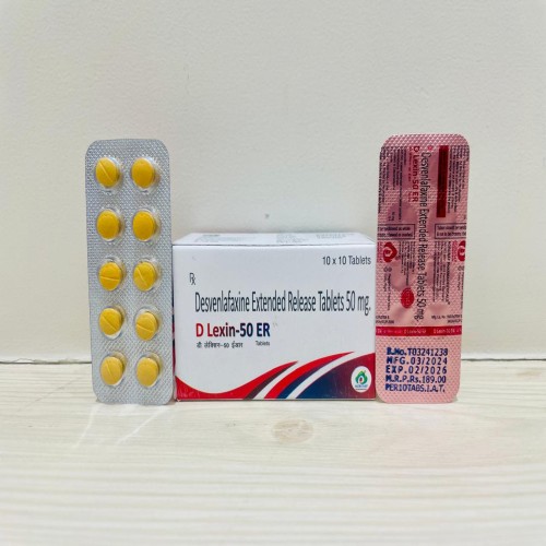 | Description: | D-LEXIN-50 ER Tablet contains Desvenlafaxine 50 mg in an extended-release formulation. Desvenlafaxine is a serotonin-norepinephrine reuptake inhibitor (SNRI) used for the treatment of major depressive disorder (MDD) and certain anxiety disorders. The extended-release (ER) formulation ensures steady drug levels throughout the day, improving symptom control, reducing side effects, and enhancing patient adherence. |