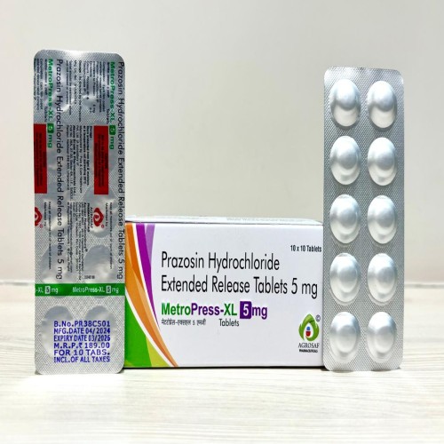| Description: | METROPRESS-XL 5 Tablet contains Prazosin hydrochloride 5 mg in an extended-release formulation. It is used for the management of hypertension (high blood pressure) and symptoms of benign prostatic hyperplasia (BPH). The extended-release formulation ensures steady drug levels throughout the day, promoting consistent blood pressure control and relieving urinary symptoms associated with BPH. |