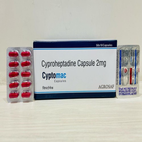 | Description: | CYPTOMAC Capsule contains Cyproheptadine 2 mg, an antihistamine with additional appetite-stimulating properties. It is commonly used to treat allergic conditions such as rhinitis, urticaria, and other hypersensitivity reactions. Additionally, Cyproheptadine is widely prescribed as an appetite stimulant, helping in weight gain and improving nutritional intake in underweight patients. It works by blocking histamine and serotonin receptors, reducing allergic symptoms and enhancing appetite. |