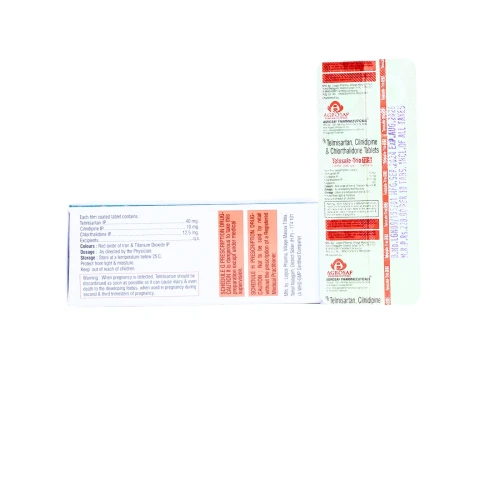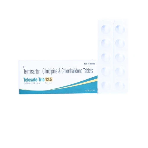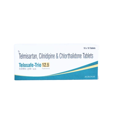 | Description: | TELOSAF-TRIO 12.5 Tablet is a triple combination of Telmisartan 40mg (an angiotensin II receptor blocker – ARB), Cilnidipine 10mg (a dual L/N-type calcium channel blocker), and Chlorthalidone 12.5mg (a thiazide-like diuretic), used for the management of moderate to severe hypertension. This advanced formulation works through multiple mechanisms—vasodilation, reduction of sympathetic activity, and elimination of excess fluid—providing superior and sustained blood pressure control along with enhanced cardiovascular and renal protection. |