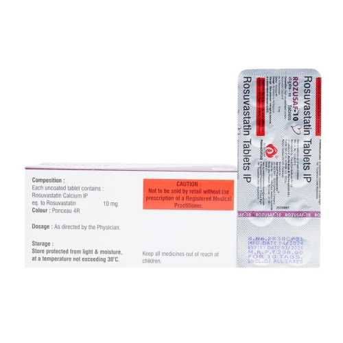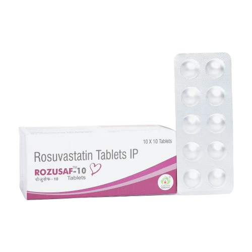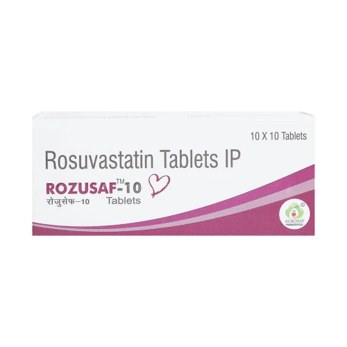 | Description: | ROZUSAF 10 Tablet contains Rosuvastatin 10 mg. It is used for the management of dyslipidemia (high cholesterol levels) and prevention of cardiovascular diseases. Rosuvastatin works by inhibiting HMG-CoA reductase, reducing LDL (bad cholesterol) and triglycerides while increasing HDL (good cholesterol), thereby improving overall lipid profile. |