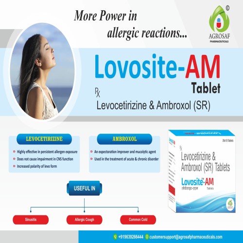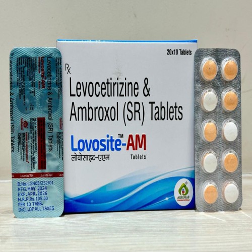 | Description: | LOVOSITE AM Tablet is a combination medicine containing: Levocetirizine 5mg – a second-generation antihistamine that helps relieve allergic symptoms. Ambroxol 75mg – a mucolytic agent that helps thin and loosen mucus in the respiratory tract. This combination is used for the treatment of allergic respiratory conditions associated with productive cough, such as allergic bronchitis, allergic rhinitis with cough, and respiratory tract infections. It helps provide relief from allergy symptoms while improving mucus clearance. |