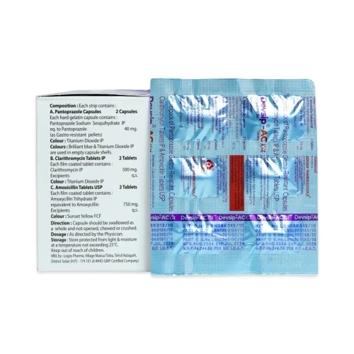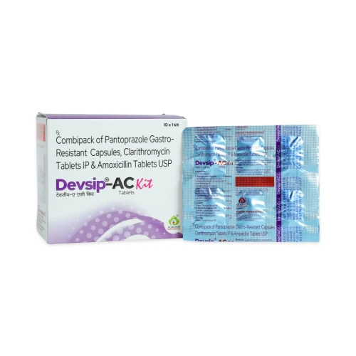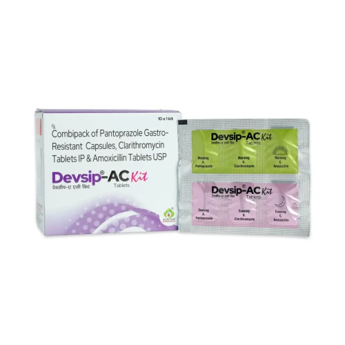 | Description: | DEVSIP AC KIT Tablet is a combination therapy containing Pantoprazole 40 mg (2 capsules), Clarithromycin 500 mg (2 tablets), and Amoxycillin 750 mg (2 tablets). This triple-drug regimen is primarily used for the eradication of Helicobacter pylori infections and the treatment of peptic ulcer disease associated with H. pylori. Pantoprazole reduces stomach acid, creating an optimal environment for antibiotics to act, while Clarithromycin and Amoxycillin eliminate bacterial infection. |