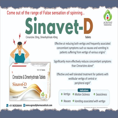 | Description: | SINAVET D Tablet is a combination medication containing Cinnarizine 20 mg and Dimenhydrinate 40 mg. It is used for the management of vertigo, motion sickness, and balance disorders. Cinnarizine improves blood flow in the inner ear and stabilizes the vestibular system, while Dimenhydrinate, an antihistamine, helps control nausea, vomiting, and dizziness. This combination provides effective and comprehensive relief from symptoms associated with vestibular disturbances. |