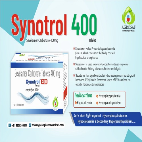 | Product Benefits: | SYNOTROL 400 Tablet contains Sevelamer 400 mg. It is used to control high phosphate levels (hyperphosphatemia) in patients with chronic kidney disease (CKD), especially those on dialysis. Sevelamer works by binding dietary phosphate in the gastrointestina |
