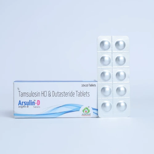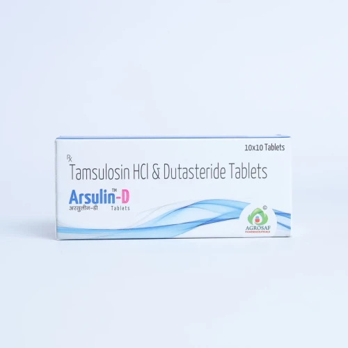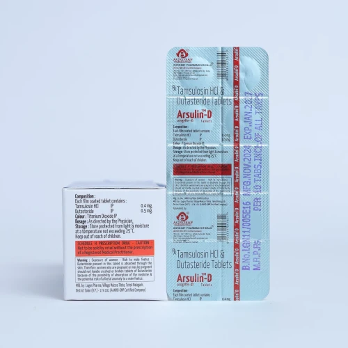 | Description: | ARSULIN D Tablet is a combination of Tamsulosin 0.4mg and Dutasteride 0.5mg, used for the treatment of benign prostatic hyperplasia (BPH) in men. Tamsulosin is an alpha-blocker that relaxes the muscles in the prostate and bladder neck, improving urine flow, while Dutasteride is a 5-alpha reductase inhibitor that reduces prostate size over time. This dual-action therapy provides both immediate symptom relief and long-term disease management. |