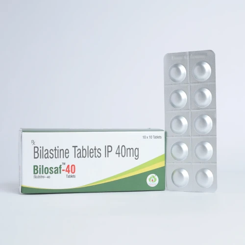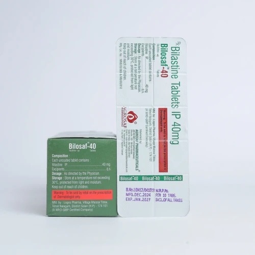 | Description: | BILOSAF-40 Tablet contains Bilastine 40 mg, a second-generation antihistamine used to manage allergic conditions such as allergic rhinitis and chronic urticaria (hives). It works by blocking histamine (H1) receptors in the body, which helps reduce symptoms like sneezing, runny nose, nasal congestion, itching, and watery eyes. BILOSAF-40 provides effective, long-lasting allergy relief with minimal sedative effects and is commonly prescribed for moderate to severe allergic reactions. |