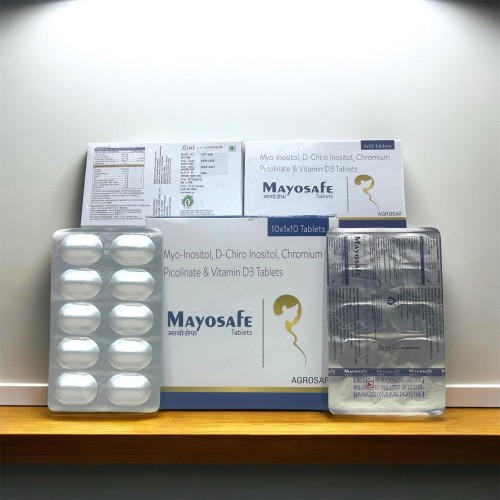 | Description: | MAYOSAFE Tablet is a nutritional supplement formulated with Myo-Inositol 550mg, D-Chiro Inositol 13.8mg, Chromium 100mcg, and Vitamin D3 200IU, designed to support hormonal balance, metabolic health, and reproductive wellness, especially in women. Myo-Inositol & D-Chiro Inositol help improve insulin sensitivity and regulate ovarian function. Chromium supports glucose metabolism and enhances insulin action. Vitamin D3 contributes to hormonal balance, bone health, and immune support. This synergistic combination is widely used in the management of polycystic ovary syndrome (PCOS), insulin resistance, and metabolic imbalances. |