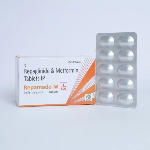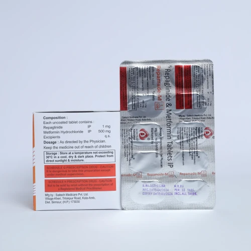 | Description: | REPAMADE-M 1/500 Tablet is a combination of Repaglinide 1 mg and Metformin 500 mg. It is used for the management of type 2 diabetes mellitus in patients requiring improved glycemic control. Repaglinide stimulates insulin release from the pancreas, while Metformin decreases hepatic glucose production and improves insulin sensitivity, providing comprehensive blood sugar control. |